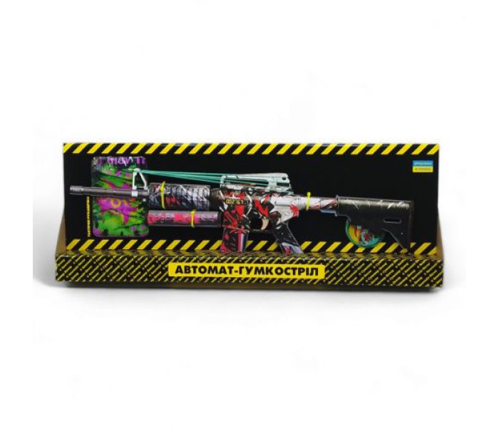Деревʼяний автомат, який стріляє резинками, з глушником. Розмір зброї - 58 см.