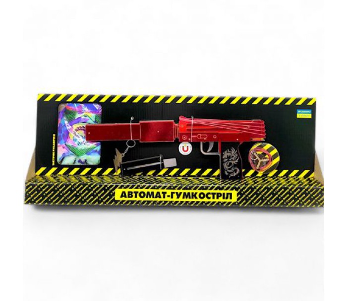 Деревʼяний автомат, який стріляє резинками. Розмір зброї - 59 см. Інструкція з використання: Переводимо ручку в ліве положення. Заряджаємо гумки починаючи з дальнього зубця. Тиснемо на гачок щоб стріляти. В комплекті з автоматом є: рукавички, резинки, брелок и фішки. Сприяє розвитку влучності, координації рухів та уяви, пропонуючи безпечну та захоплюючу ігрову альтернативу.Колір рукавичок та аксесуари у наборах попадаються рандомно.