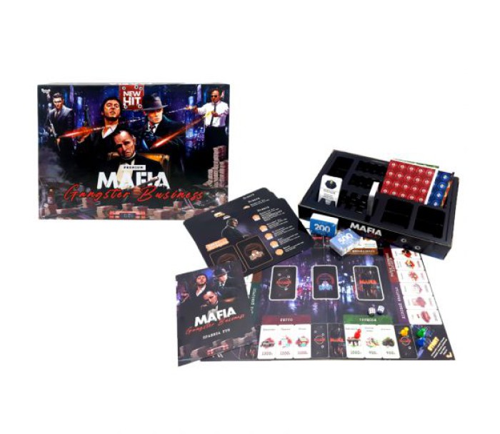 Комплектація: 24 картки бізнесу, 28 карток подій, 44 картки мафії, 16 карт помічників, 180 грошових купюр, 4 фішки бомби, 96 фішок впливу, 4 фішки гравця, 2 кубики, ігровий органайзер