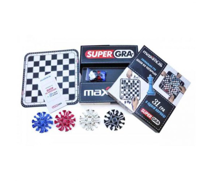 Комплектація: Поле для гри в класичні шашки та шахи, поле для гри в шашки та шахи на чотирьох, 4 комплекти шашок – 48 штук, 4 комплекти шахів – 64 штуки, інструкція для 31 гри