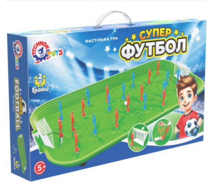 Настільна гра "Супер Футбол ТехноК". Комплект включає поле для гри, 2 команди (по 11 гравців) і запасних гравців. Пружинний механізм гри.