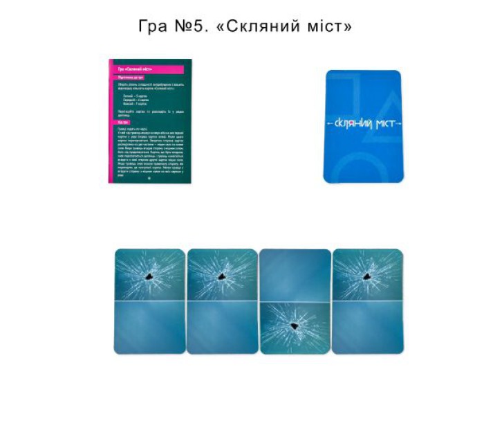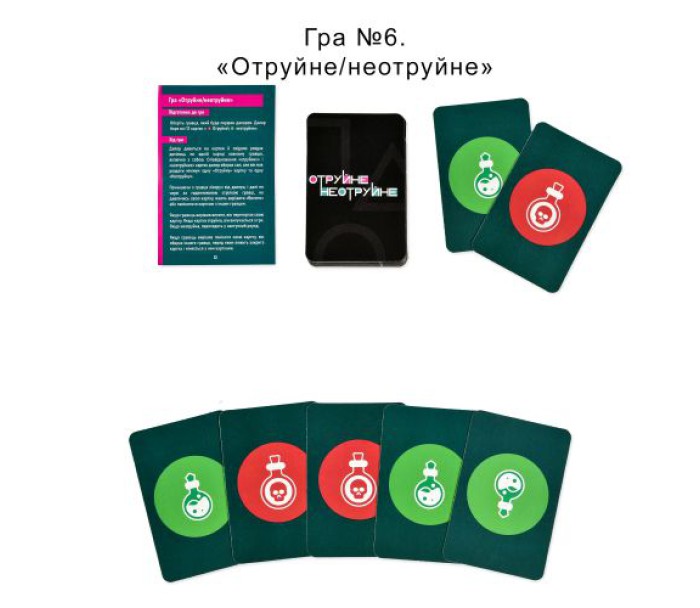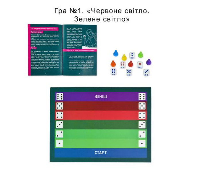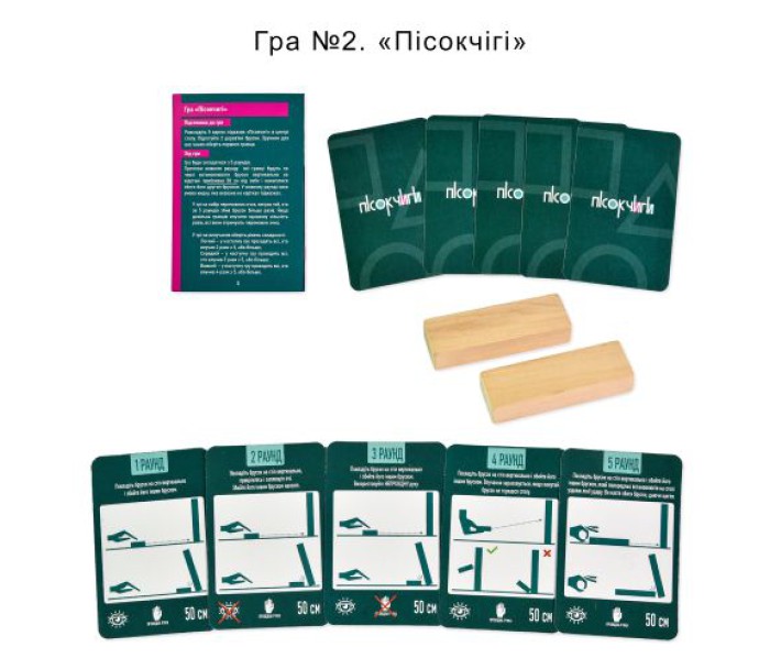 Комплектація: Коробка, ігрове поле, гральні кубики - 6 шт., фішки - 6 шт., дерев'яні бруски - 2 шт., маркер, картки 54 шт., прозора картка, інструкція.