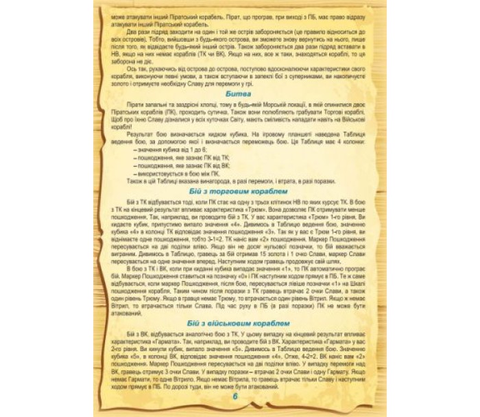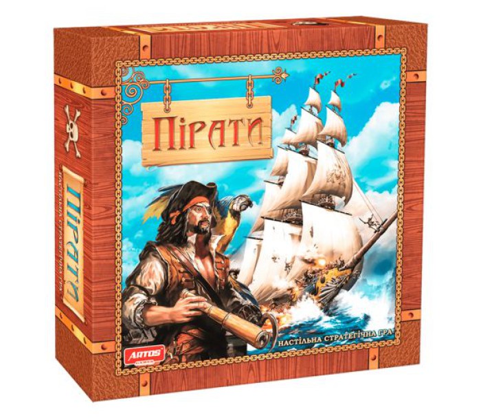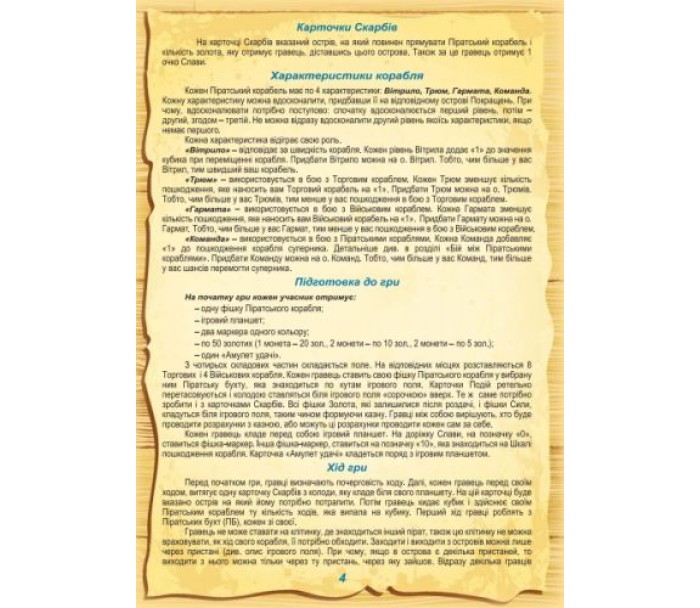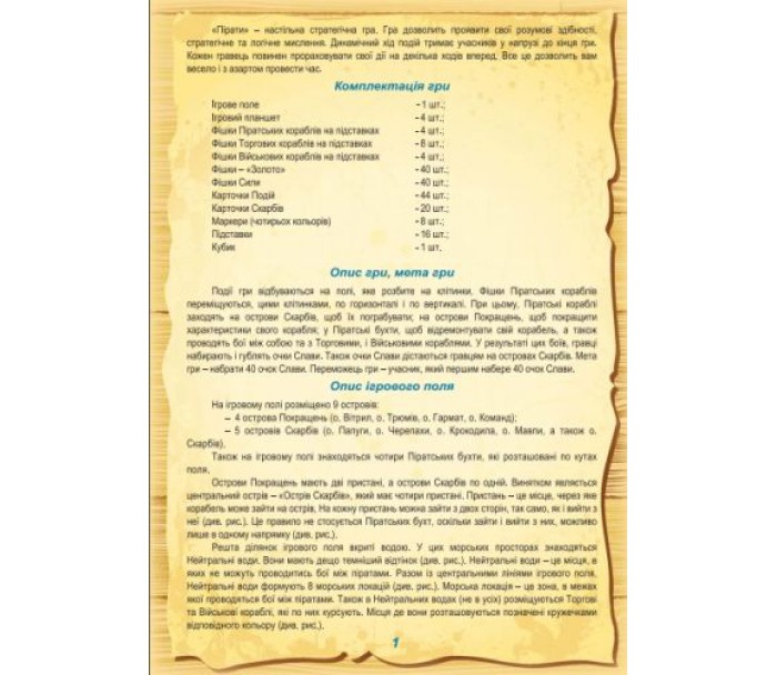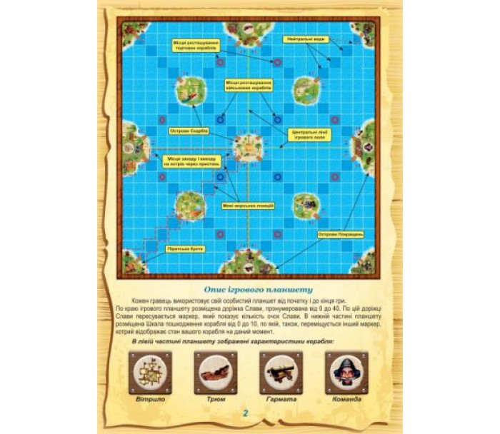 Комплектація: Ігрове поле, ігровий планшет, фішки піратських кораблів (4 шт), фішки торгових кораблів (8 шт), фішки "золото" (40 шт), фішки "сили" (40 шт), картки подій (44 шт), картки скарбів ( 20 шт), маркери (8 шт), підставки (16 шт), кубик, правила