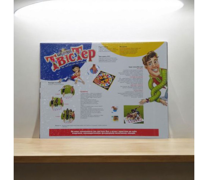 Гра "Твістер гранд". Правила гри: гравець крутить рулетку, яка показує що поставити (яку руку або ногу) на коло певного кольору. Не можна торкатися "поля" колінами і ліктями. Комплектація: велике ігрове поле (1800х1300 мм), рулетка, кнопка, стрілка.