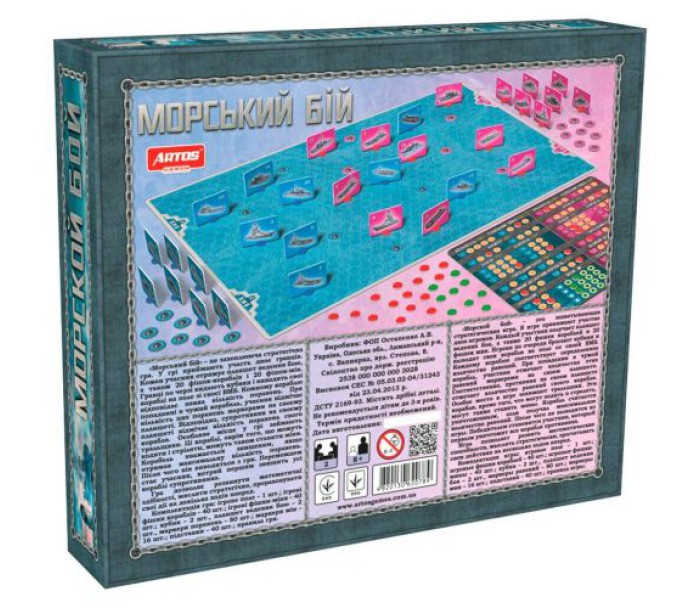Комплектація: Ігрове поле, кораблі на підставках (40 шт.), Міни (40 шт.), Кубики (2 шт.), Планшеті ведення бою (2 шт.)