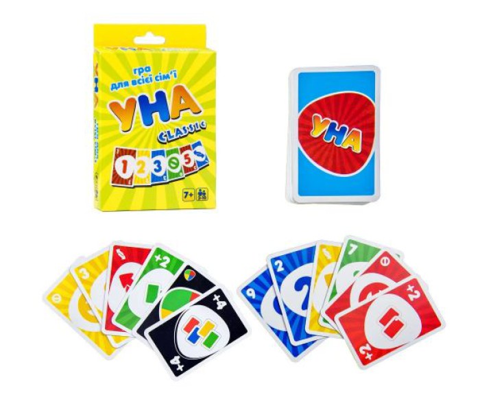 Карткова гра УНО (UNO). Колода для гри в Уно містить карти з цифрами від 0 до 9 чотирьох кольорів, а також - спеціальні: «Пропусти хід», «Навпаки», «Візьми дві», «Замов колір» і «Замов колір і візьми чотири». Кожному роздається по 7 карт, після чого закладається одна для скидання. Мета гри - першим позбутися всіх карт.