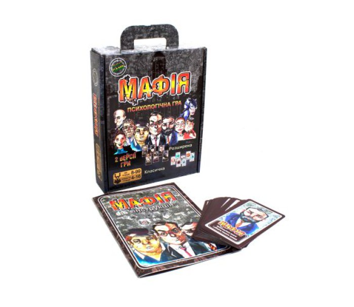 Гра "Мафія". Командна, психологічна, рольова гра з детективним сюжетом. 2 версії гри: класична і розширена. Завданням Мафії буде вбити всіх мирних жителів і залишитися в місті в більшості. Набір містить: 16 карток з персонажами (картка ведучого, 3 мафіозі, перевертень, маніяк, жінка-кішка, ніндзя, лікар, комісар, детектив, шпигун, 4 мирних жителя) і 25 карток для розширеної версії гри.