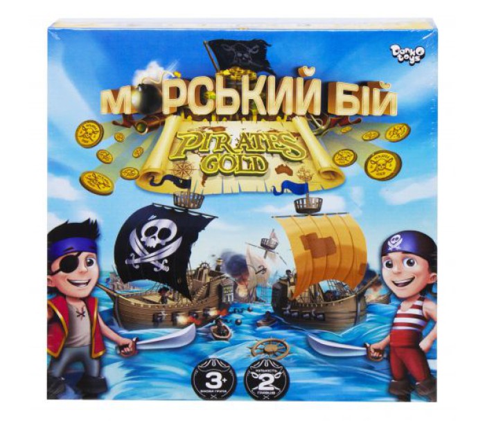 Настільна розважальна гра "Морський бій. Pirates Gold". Юні буканьери потоплять ворожі і отримають за це золоті монети. А ще навчаться називати кольору, вважати і мислити логічно. 4 ігрових поля, 30 фішок кораблів і золотих дублонов, 70 фішок гарматних пострілів.