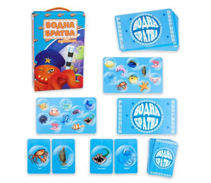 Настільна гра "Водна братва". Розвиває пам'ять та концентрацію. Кожен бере 5 карток із зображенням водних жителів. Ведучий на 10 секунд показує малюнок великої карти. Треба запам'ятати більше риб з цієї карти, щоб потім викласти їх зі своїх. Можна використовувати козир - офіцера-восьминога. Якщо виклали козир, або правильну картку - забираєте собі в улов. Переможе той, хто має більший улов. Можуть грати від 3 до 6 людей. Гра дуже яскрава і сподобається дитині. Виготовлено з якісних та безпечних матеріалів. В комплекті 54 маленькі карточки, 10 великих та інструкція.