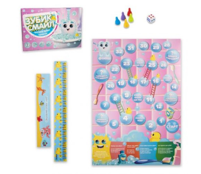 Ласкаво просимо до захоплюючої настільної гри "Зубик смайл"! Вона створена, щоб навчити дітей важливості правильного чищення зубів. Мета гри - перемістити свою фішку зі Старту а Фініш скоріше за інших. Кожен хід гравці кидають кубик і ходять на стільки клітинок, скільки випало на кубику. Але будьте уважні! На полі є спеціальні клітинки з завданнями і, якщо ви потрапляєте на них, вам потрібно буде відповісти на запитання, перш ніж продовжувати свій хід. Ці запитання повʼязані з чищенням зубів та допоможуть дітям навчитися правильно доглядати за ротовою порожниною.