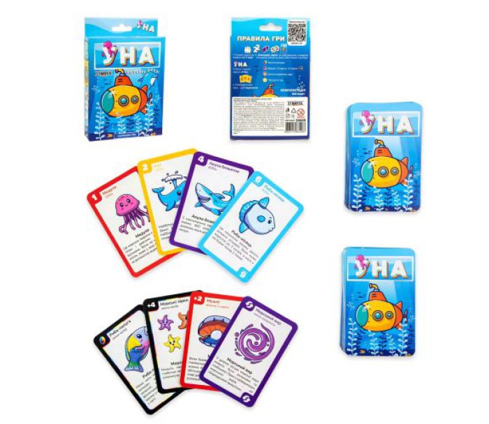 Карткова гра "Уна" (Uno) налічує 108 карт, що включають: чотири кольорові "масті", карти дії ( "Візьми дві", "Хід назад" та "Пропусти хід"), "дикі" карти і "дикі" карти "Візьми чотири". Наприкінці кожної партії підраховуйте окуляри окуляри гравців окремо. Гра закінчується, коли один гравець залишається повністю без карток. Йому дістаються всі очки. Інструкція у комплекті. Грати можуть від 2 до 10 гравців.