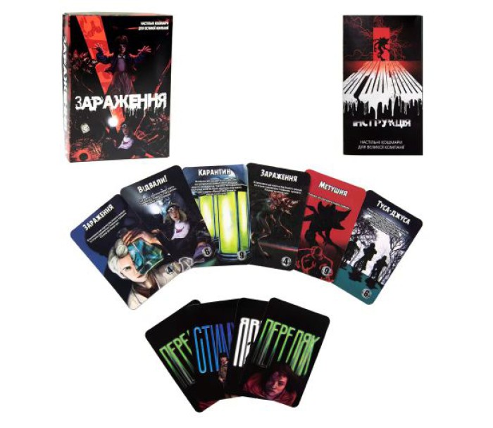 Настільна гра"Зараження" - це гра для великих компаній, яка додасть у ваше дозвілля нотки загадковості. Ви - група друзів, які хочуть розгадати таємницю зникнення людей. Намагаючись дізнатись правду, ви знаходите лабораторію, в якій хтось з вас помічає якесь створіння... Перевірте свою інтуїцію та довіру до своїх друзів. Обмінюючись картами, ви зможете садити суперників або себе на карантин і пускати в хід телекінез проти тих, хто викличе найбільше сумнівів. Будьте обачними та скоріше знайдіть створіння, яке всіх заражає.
