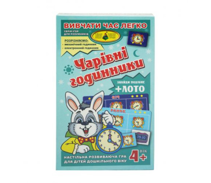 Комплектація: Ігрове поле - 4 шт., Картки з малюнками годин - 48 шт. (24 пари), правила гри.