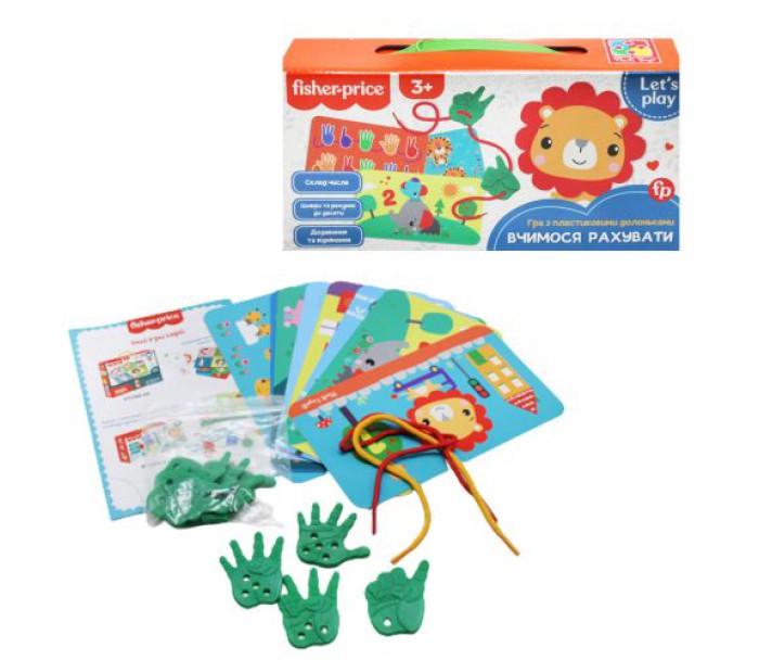 Комплектація: 10 карток із завданнями, 10 долоньок для рахунку, 2 шнурочки, інструкція