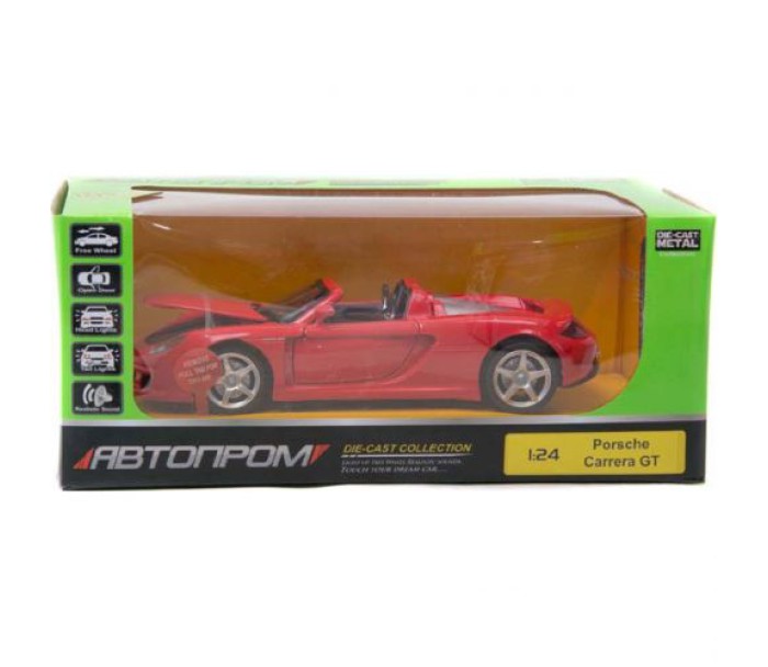 Машинка "Porsche Carrera GT" з серії "Автопром". Металева. Відкриваються двері, капот і багажник. Має світлові і звукові ефекти. Висока деталізація інтер'єру і екстер'єру. Масштаб - 1:24.
