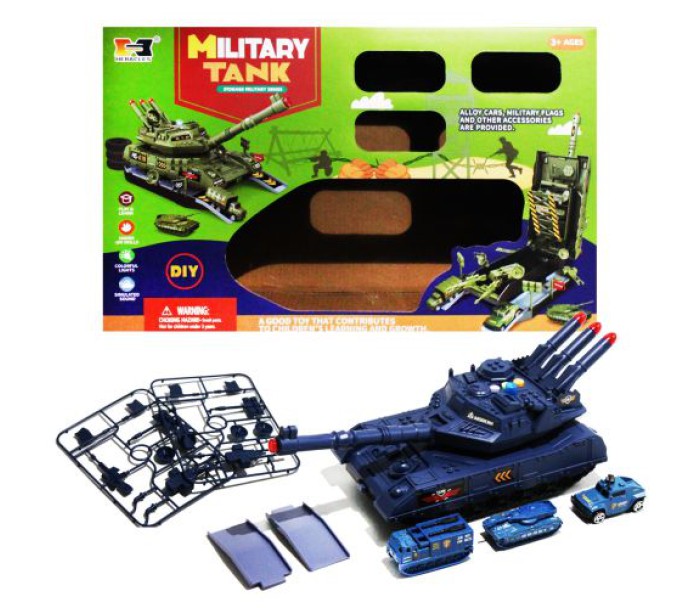 Комплект з танком. В набір входить танк, 3 машинки, трап, наклейки та допоміжні деталі. Танк має світлові та звукові ефекти, працює на двох батарейках. Також башта і гармата рухомі і можуть зніматися. Люки відкриваються. Знизу в танка є кнопка, натиснувши яку можна відкрити таємне відділення, де можна зберігати машинки. Виготовлено з якісних матеріалів. Набір дуже цікавий та незвичний та чудово підійде для ігор. Допоможе розвивати логічне мислення, дрібну моторику.