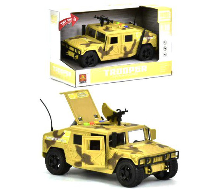 Інтерактивний інерційний військовий броньований джип. На даху встановлено автомат. Відкриваються двері і багажник. Має звукові і світлові ефекти. Виготовлений з якісного пластику. Масштаб: 1:16.