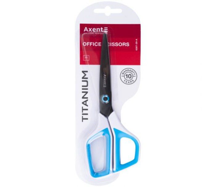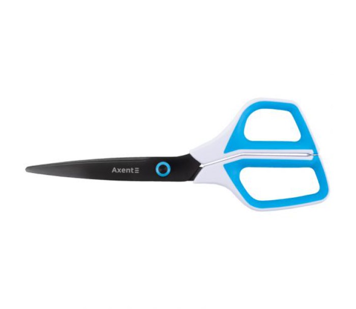Офісні ножиці з пластиковими ручками ергономічної форми Axent Titanium. Використовуються для різання паперу, картону, тканини та ін. Якісні матеріали та збірка, продумані деталі ножиць забезпечують комфортну, безпечну роботу і довговічність. Особливість ножиць серії Axent Titanium - особлива форма лез, виготовлених з високоякісної сталі та вкриті покриттям Gun Black Titanium, що робить їх ще більш міцнішми, зносостійкими, та прослужать довше. Особлива заточка лез робить їх в три рази гостріше аналогів, а їх кінчики закруглені для безпечної роботи. Леза щільно прилягають один до одного, забезпечують плавний і м'який хід. Папір розрізається легко і без зминання. Ручки виготовлені за технологією подвійного лиття, що робить їх міцними та надійними. Зручність і комфорт у використанні, стильний дизайн. Упаковка - блістер.