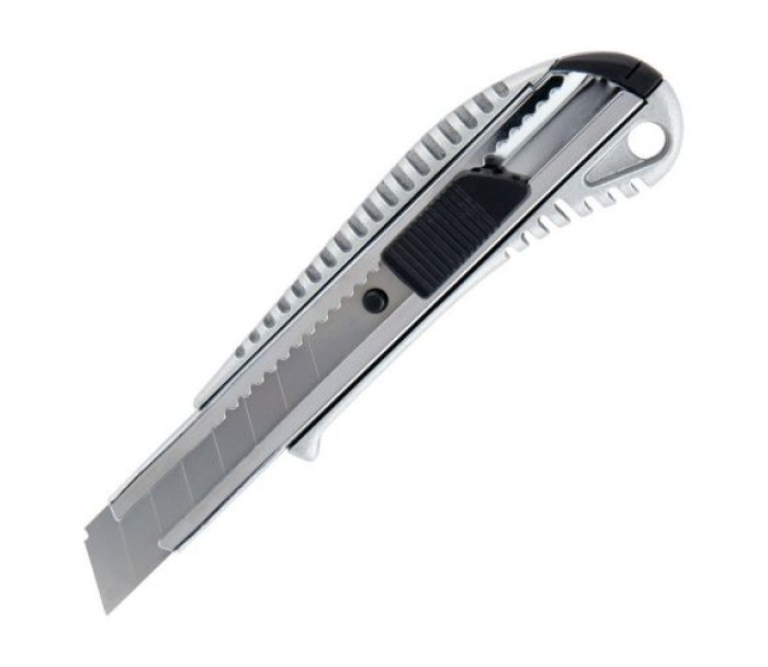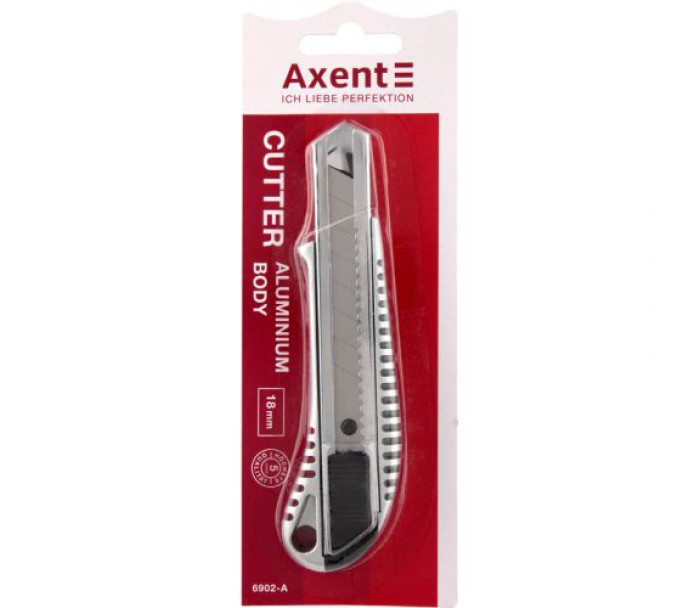 Канцелярський ніж Axent - це надійний, безпечний і довговічний інструмент для використання в офісі, на складі, на виробництві або в побуті завдяки поєднанню якості матеріалу, продуманості деталей і надійності механізму. Сталеве багатосекційне лезо забезпечує найвищу функціональність, стійкість, гостроту. Міцний металевий корпус з алюмінію стійкий навіть до інтенсивних навантажень. Металеві направляючі та механізм фіксації Twist-Lock (коліщатком) забезпечують ступеневу подачу леза, безпечну роботу, виключають ризик раптового випадання або провалювання леза. Кришечка з пазом дозволяє просто і безпечно обламати затуплену частину леза уздовж лінії насічки і продовжувати користуватися гострим лезом. Ергономічний дизайн корпусу адаптований під форму долоні. У корпусі є отвір для шнурка. Блістерна упаковка.