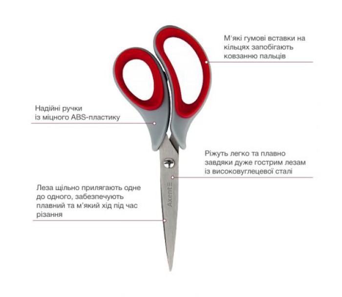 Офісні ножиці з пластиковими ручками - використовуються для різання паперу, картону, тканини та ін. Якісні матеріали та збірка, продумані деталі офісних ножиць Axent забезпечують комфортну, безпечну роботу і довговічність. Леза - з високоякісної сталі, міцні і стійкі до корозії, не потребують додаткового заточування. Кінчики лез закруглені для безпечної роботи. Леза щільно прилягають один до одного, забезпечують плавний і м'який хід. Папір розрізається легко і без зминання. Рукоятки з міцного пластику, стійкі до навантажень. Особливість серії Axent Duoton Soft - м'які гумові вставки на кільцях, які підвищують зручність та комфорт використання, запобігають ковзанню пальців. Ергономічна форма рукоятки повторює анатомічний вигин долоні. Двоколірний дизайн в класичних кольорах Axent.