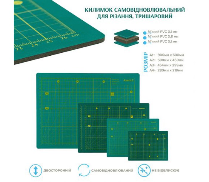 Двосторонній макетний килимок з щільної основи тришарового синтетичного матеріалу дозволяє різати ножем м'яко і безпечно. Використовується для різання паперу, тканини, картону, шкіри і т.д. Сантиметрова та дюймова шкала. Має властивість самовідновлення після розрізів. Розмір А3+ (454мм*299мм). Товщина 3 мм.