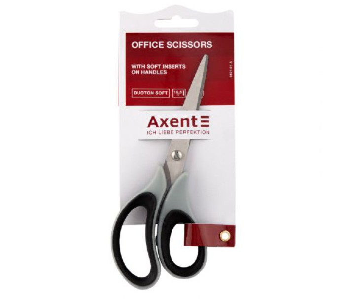 Офісні ножиці з пластиковими ручками - використовуються для різання паперу, картону, тканини та ін. Якісні матеріали та збірка, продумані деталі офісних ножиць Axent забезпечують комфортну, безпечну роботу і довговічність. Леза - з високоякісної сталі, міцні і стійкі до корозії, не потребують додаткового заточування. Кінчики лез закруглені для безпечної роботи. Леза щільно прилягають один до одного, забезпечують плавний і м'який хід. Папір розрізається легко і без зминання. Рукоятки з міцного пластику, стійкі до навантажень. Особливість серії Axent Duoton Soft - м'які гумові вставки на кільцях, які підвищують зручність та комфорт використання, запобігають ковзанню пальців. Ергономічна форма рукоятки повторює анатомічний вигин долоні. Двоколірний дизайн в класичних кольорах Axent.