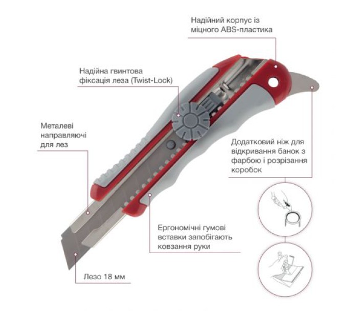 Канцелярський ніж Axent - це надійний, безпечний і довговічний інструмент для використання в офісі, на складі, на виробництві або в побуті завдяки поєднанню якості матеріалу, продуманості деталей і надійності механізму. Гостре і стійке сталеве багатосекційне лезо і додатковий ніж для відкриття банок з фарбою і розрізання коробок забезпечують найвищу функціональність і широту застосування. Міцний пластиковий корпус стійкий до навантажень, не розбивається при падінні. Металеві направляючі та механізм фіксації Twist-Lock (коліщатком) забезпечують ступеневу подачу леза, безпечну роботу, виключають ризик раптового випадання або провалювання леза. Кришечка з пазом дозволяє просто і безпечно обламати затуплену частину леза уздовж лінії насічки і продовжувати користуватися гострим лезом. Ергономічний дизайн корпусу адаптований під форму долоні, прогумовані ручки запобігають ковзанню руки. У корпусі є отвір для шнурка. Блістерна упаковка.