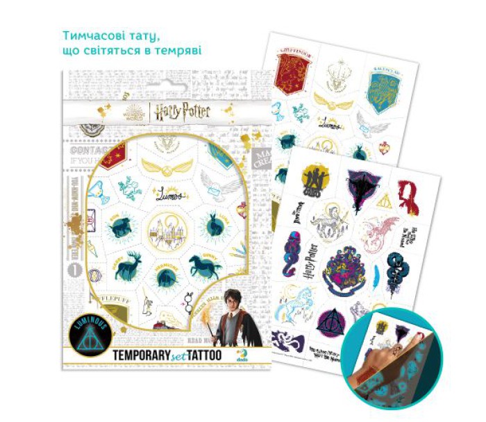 набір, дитячих, тимчасових, татуювань, двох, аркушів, формату, мотивами, легендарного, всесвіту, гаррі, поттера, чудовий, спосіб, порадувати, фанатів, магії, пригод, усередині, яскраві, зображення, героїв, символів, факультетів, чарівних, паличок, гоґвортсу, культових, елементів, тату, наносяться, безпечні, для, дитячої, Dodo, 200505