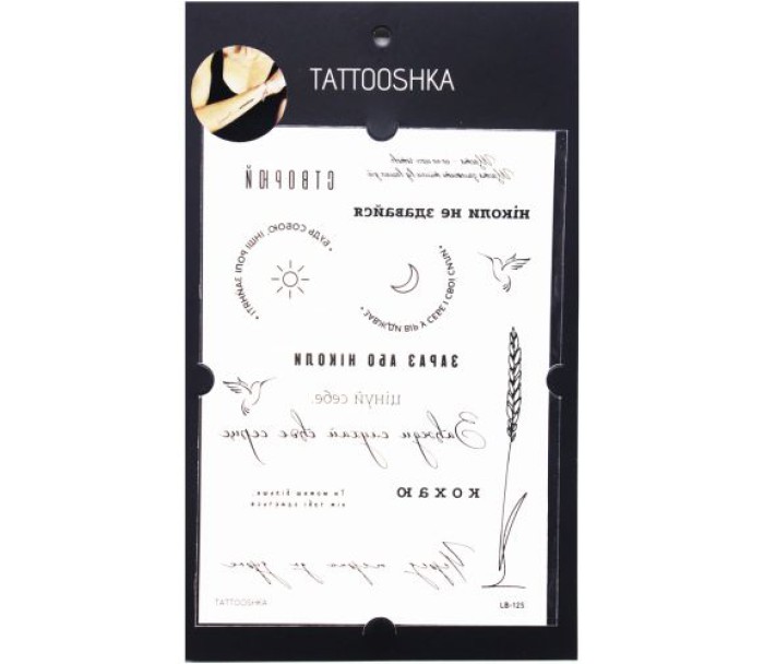 Набір татуювань-перебивок "Tattooshka". В пакувальному патріотичні татуювання. Вирізати необхідне тату, наклеїти на руку або іншу частину тіла, змочити теплою водою, відклеїти. Розмір листа з татуюванням: 15х21 см.