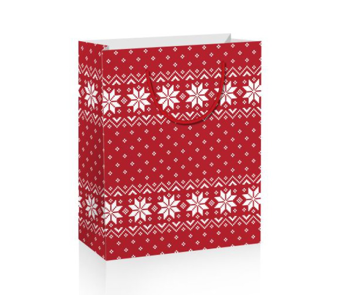 Яскравий подарунковий пакет із красивим новорічним орнаментом. Оснащений зручними ручками-мотузками. Матеріал: картон. Розмір пакета: 26х13х32 см.