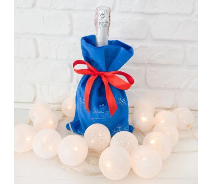 М'який мішок для шампанського з стрічкою. Допоможе прикрасити подарунок чи святковий стіл. Пляшку можна закріпити за допомогою стрічок. Розмір мішка: 30х20 см.