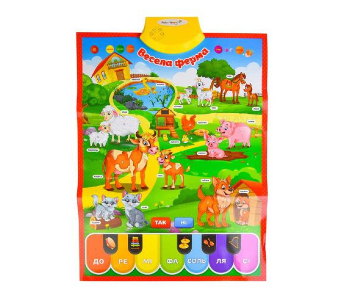 Інтерактивний плакат. Відмінно підійде для вивчення домашніх тварин. Функції: "Вчимо назви тварин"; "Відгадай загадку"; "Голоси тварин"; гра ( "Де чия мама?" / "Так чи ні"). Є кнопка вкл / викл і кнопки регулювання гучності. Розмір плаката: 45х60 см.