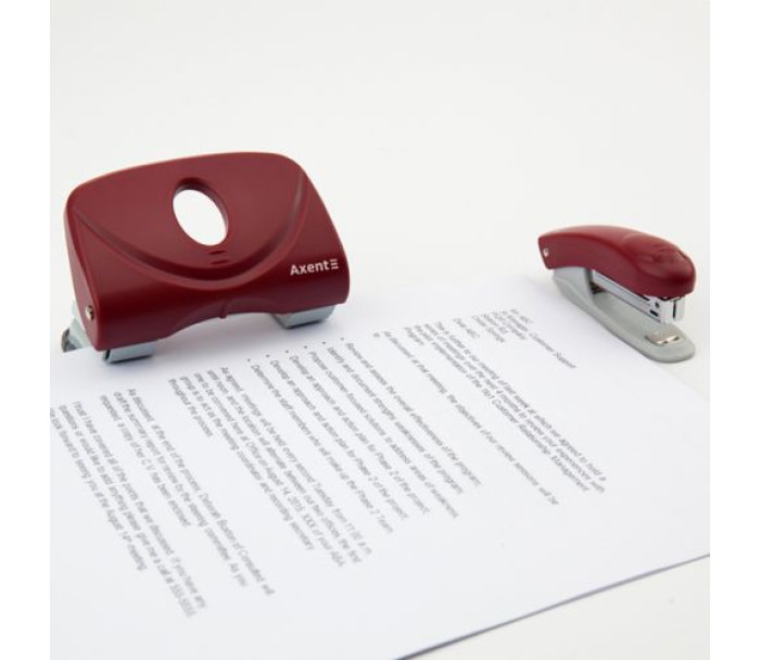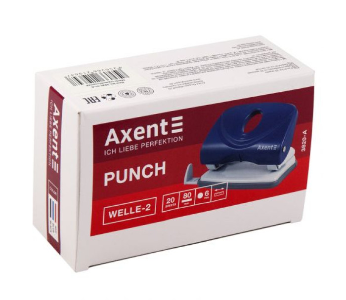Діркопробивач Axent серії Welle-2 виділяється яскравим кольором і ергономічним дизайном рукоятки. Зроблений з якісного ABS-пластику - це сучасний матеріал міцний і легкий, не б'ється при падінні. Всі основні і робочі механізми - металеві, забезпечують надійну роботу діркопробивача. Леза довго залишаються гострими. Для зручності діркопробивач оснащений висувною обмежувальною лінійкою з точною шкалою форматів паперу (А3, А4, А5). Висувна лінійка необхідна для позиціонування аркушів паперу, які вставляються в діркопробивач, і дозволяє завжди отримувати точний результат і однакові стоси підшитих документів зі співпадаючими отворами. Знімний резервуар для конфетті відкривається м'яко. Прогумована підошва запобігає ковзанню діркопробивача по поверхні. Діаметр отвору 6 мм, відстань між пробитими отворами 80 мм.