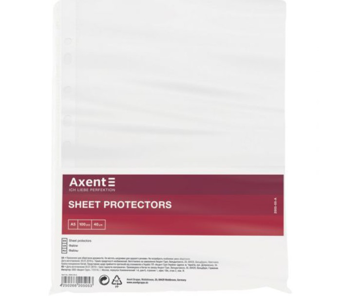 Файли захищають папери від оточуючих впливів і механічних пошкоджень. Завдяки наявності перфорації документи в файлах можуть зберігатися в папках-реєстраторах, в папках на кільцях, в папках-швидкозшивачах та ін. Це забезпечує систематизацію та зручність у роботі з документами. Файли Axent виготовлені з первинного пластику, який забезпечує максимальну прозорість файлу та ідеальну глянцеву поверхню. Корінець надійно спаяний з файлом - файл залишається цілісним і витримує тривалу експлуатацію. Щільність 40 мкм - підходить для частого використання. Для паперів формату А5.