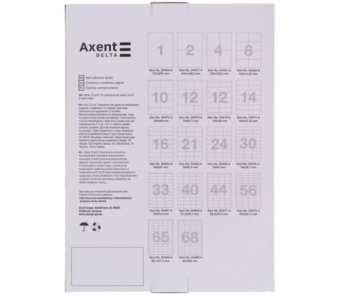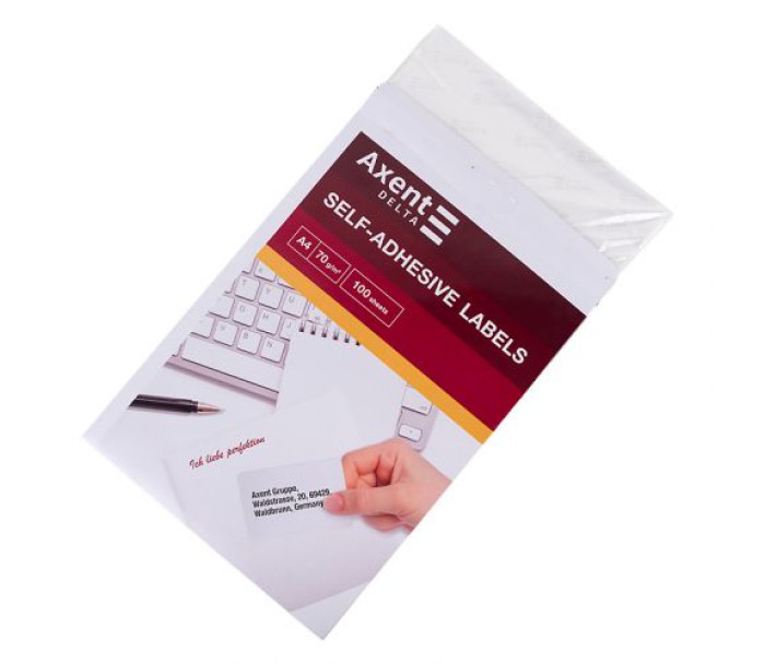 Універсальні етикетки з клейким шаром Axent Delta незамінні для адресації листів і посилок, штрих-кодування товарів, класифікації документів, створення інформативних наклейок, маркування в домашніх умовах (наприклад, коробок з речами) і т.д. Штрих-коди або інші інформаційні наклейки легко створити за допомогою цих етикеток і лазерного або струминного принтера, копіювального апарату. Самоклеючі етикетки мають формати, сумісні з найбільш відомими комп'ютерними програмами. Автоматична подача паперу в принтерах. Розмір А4, 100 аркушів. Висока якість паперу (щільністю 70г/м2) і клейового шару забезпечує чіткий друк і зручне нанесення наклейок на поверхню. Індивідуальна упаковка - картонна коробка.