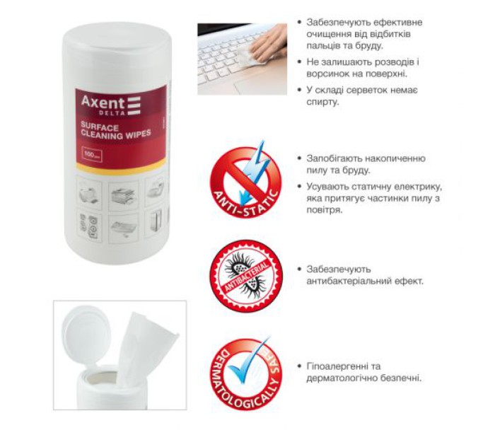 Серветки для догляду за оргтехнікою Delta by Axent - ефективне і доступне рішення для очищення поверхонь оргтехніки і офісних меблів. Дерматологічно безпечні. Матеріал - крепований папір - не залишає ворсинок. Мають антистатичні властивості, завдяки чому пил значно менше осідає на поверхню.